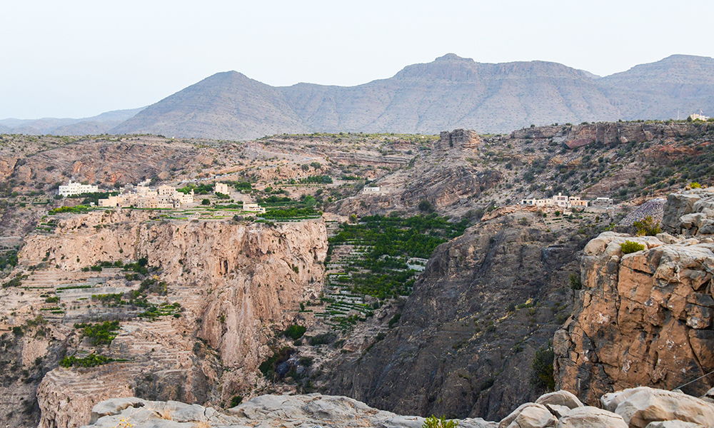 Kanskje på grunn av den beskyttede beliggenheten i skyggen av Omans høyeste fjell Jabal Shams (2997 moh), eller på grunn av de mange (dog minkende) vannkildene, er Jabal Akhdar et av landets mest fruktbare områder. Det ser kanskje ikke sånn ut, når man kjører den svingete veien fra Nizwa på 500 moh, lynbratt opp til landsbyen på over 2000 moh, gjennom et ørkenlignende, steinete landskap. Men så plutselig åpenbarer et dalsøkk seg med grønne, terrasserte fjellsider, der det gror granatepler, aprikoser og oliven.