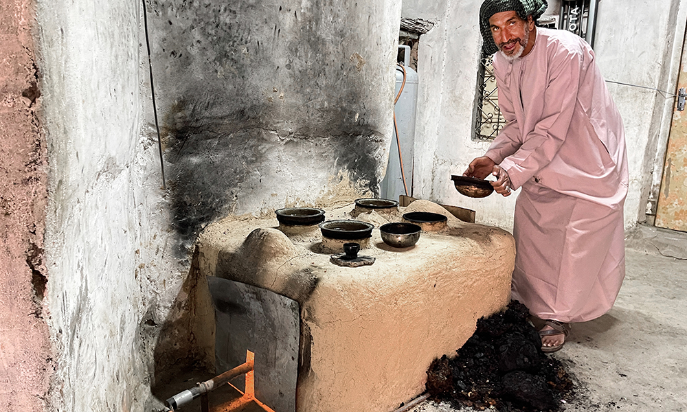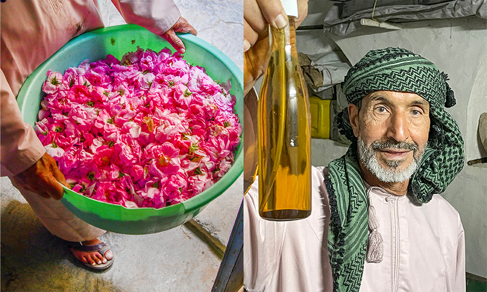 Å utvinne rosevann krever tålmodighet, og Nasser Abdullah Al-Falahi viser gjerne hvordan han jobber. Det lille rommet er varmt som en badstue, og han står bøyd over en Al-duhjan, en enkel leirovn med fire like kobberkjeler. Først må bladene varmes i et stort kar, der dampen samles i en kobberbolle, før væsken skal fordampe over varme i flere timer. Tre kilo roseblader gir under en halv liter rosevann. Om du kjøper det på nettet, koster rosevann rundt 600 kroner literen ferdig destillert. Men det er i det minste anvendelig: