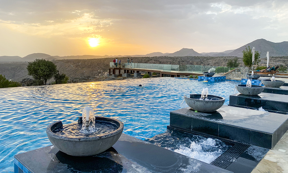 Anantara Jabal Akhdar er i seg selv en oase for skjønnhet og sunnhet, ro og avslapning. Resorten smykker seg med å være en av verdens høyestliggende luksusresorter, men det er konsekvensen av beliggenheten som betyr mest; hotellet er bygget på kanten av en klippe, med utsikt over endeløse fjell, en dyp canyon og De fem landsbyene som vi siden skal besøke. Det er umulig å ikke bli bergtatt av omgivelsene.