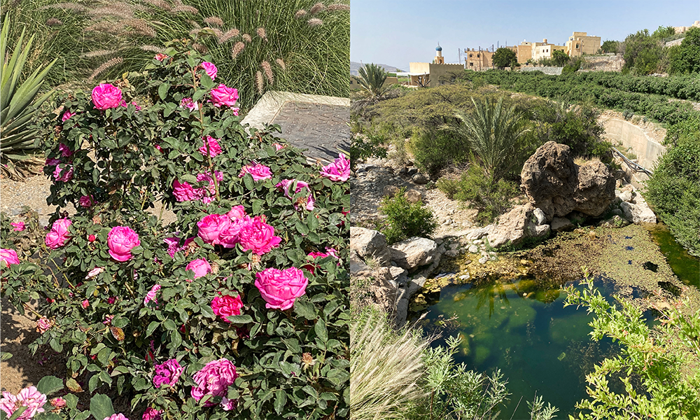 Den bitte lille fjellandsbyen ligger på kanten av en fjellvegg som stuper loddrett ned i en dal mange hundre meter lenger ned – også kjent som Omans Grand Canyon. Fjellsidene er terrassert i grønne flater, hvor det gror granatepler, aprikoser og oliven – trær som trenger lite vann for å overleve. Fahmi vokste selv opp i nabolandsbyen, og han lærte faktisk å svømme i dammen som i dag er vannkilde til rosebuskene.