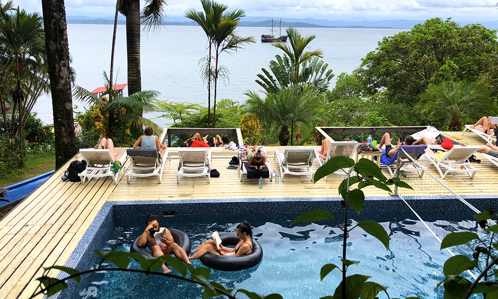 Alt på Bocas del Toro er bare en «liten taxibåt» unna, inkludert hostellet vi skal sjekke ut – Bambuda Lodge som selv reklamerer med at de er det eneste hostellet i Bocas del Toro som ligger rett ved sjøen, har et stort svømmebasseng og en 50 meter lang vannsklie fra baren og ned i sjøen – sannsynligvis den eneste i hele Karibia.