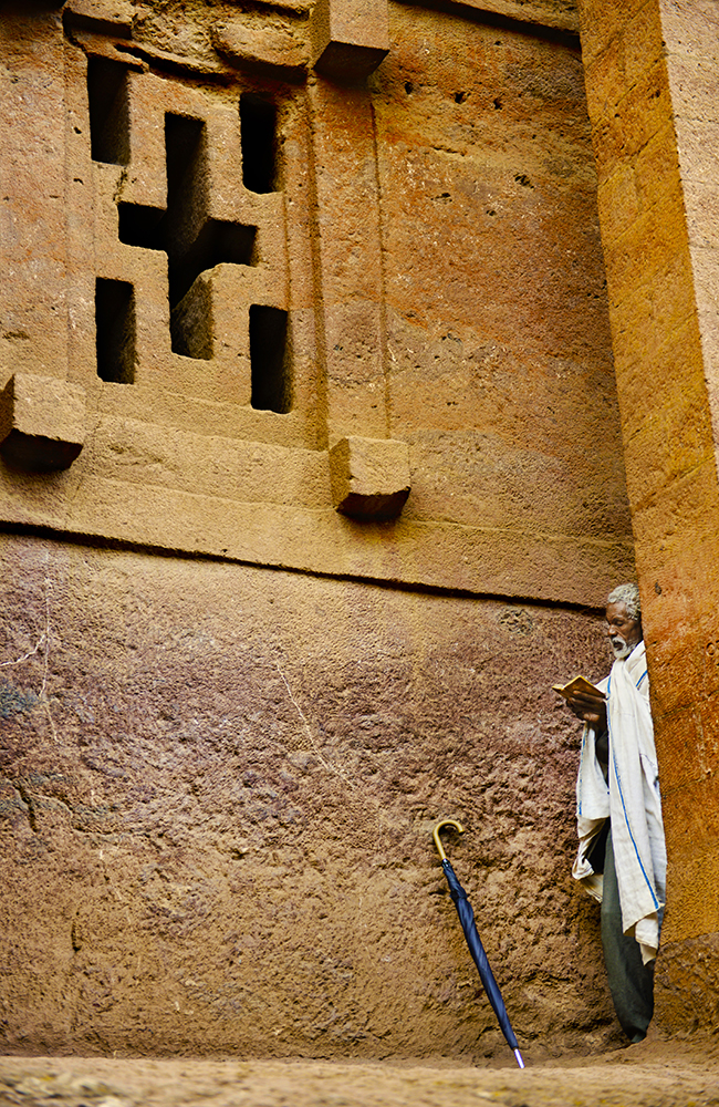 Venstrehånden hviler på vandrestaven, de bare føttene er sprukne og nesten grå. Pilegrimen har gått til fots fra Gonder, åtte dager tok det ham og det er andre gang han gjør det. Han er langt fra den eneste. Overalt i de skyggefulle sjaktene sitter pilegrimer og ber.
