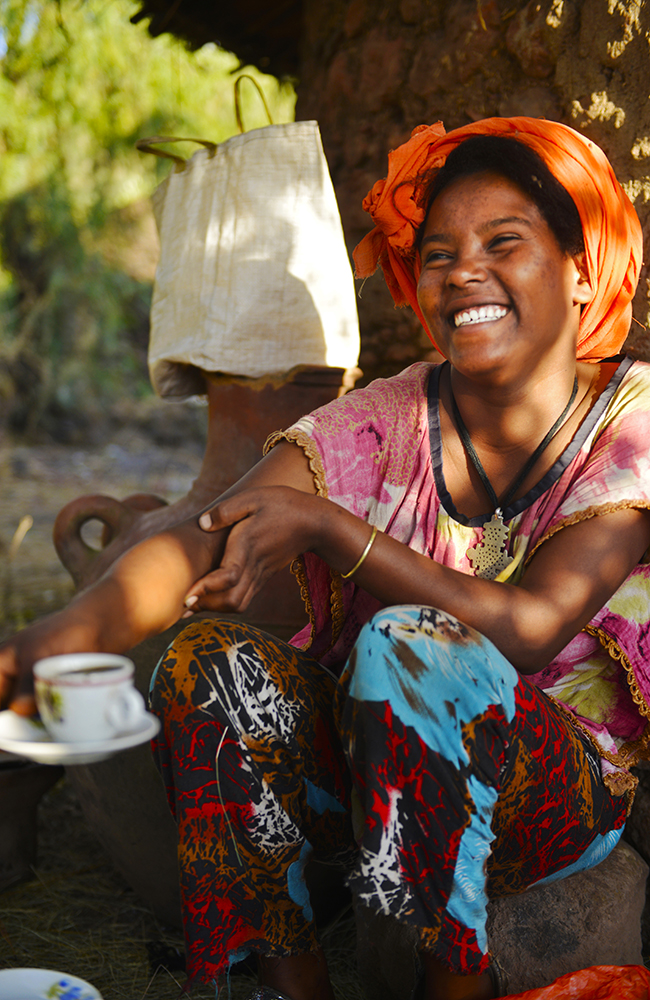 Vi kipper av oss sandalene og tasser inn i mørket i én kirke, trer dem på igjen og huker oss gjennom en bit etiopisk grunnfjell for å komme til den neste. Vi ser folk bed mens fingrene teller med rosenkransen, hører den gutturale sangen fra en messe, kjenner duften av røkelse kile i nesa. I Bet Meskel finner presten Mesganawe Tarekegh frem georgskorset så min guide kan få sin velsignelse.