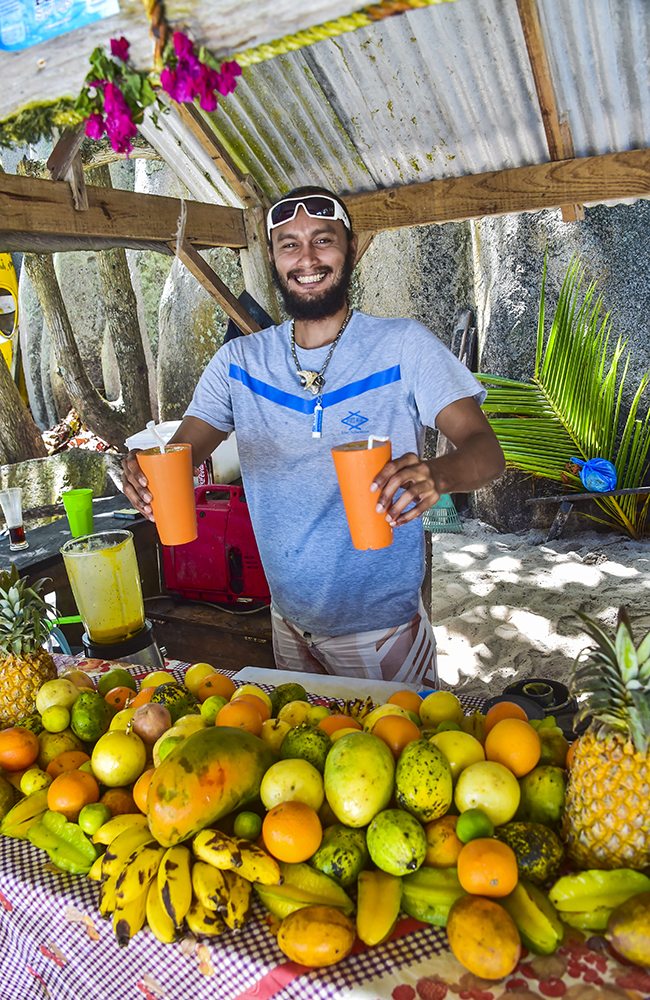 Gå ikke glipp av verdens beste fruktsmoothie som du får i en fargerik bod på stranda Anse Sourse d´Argent.