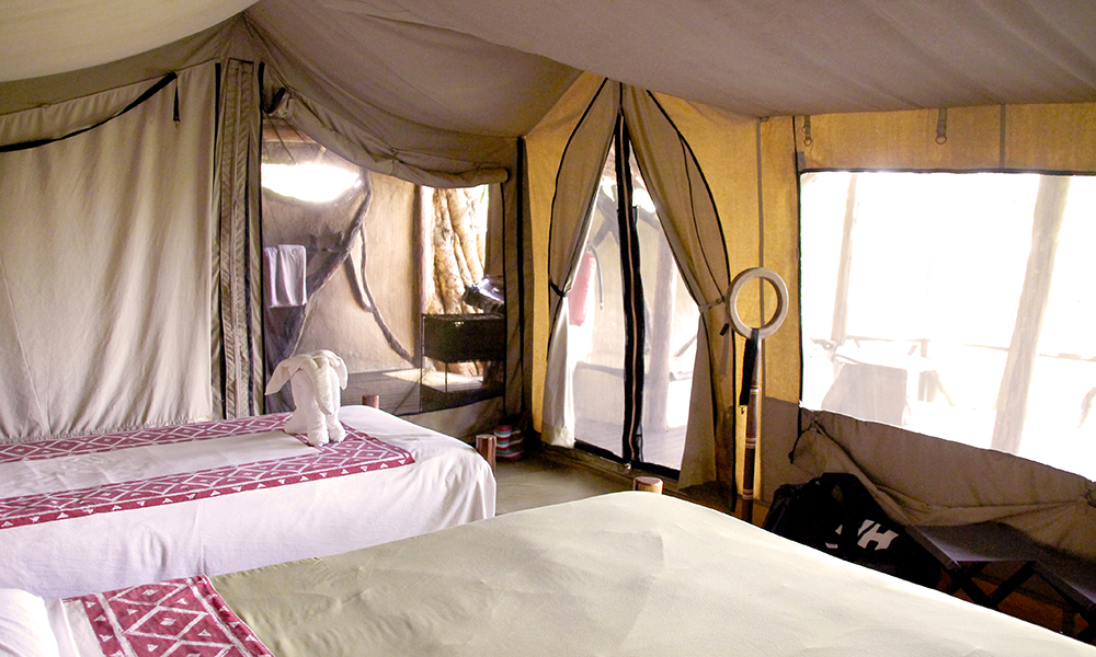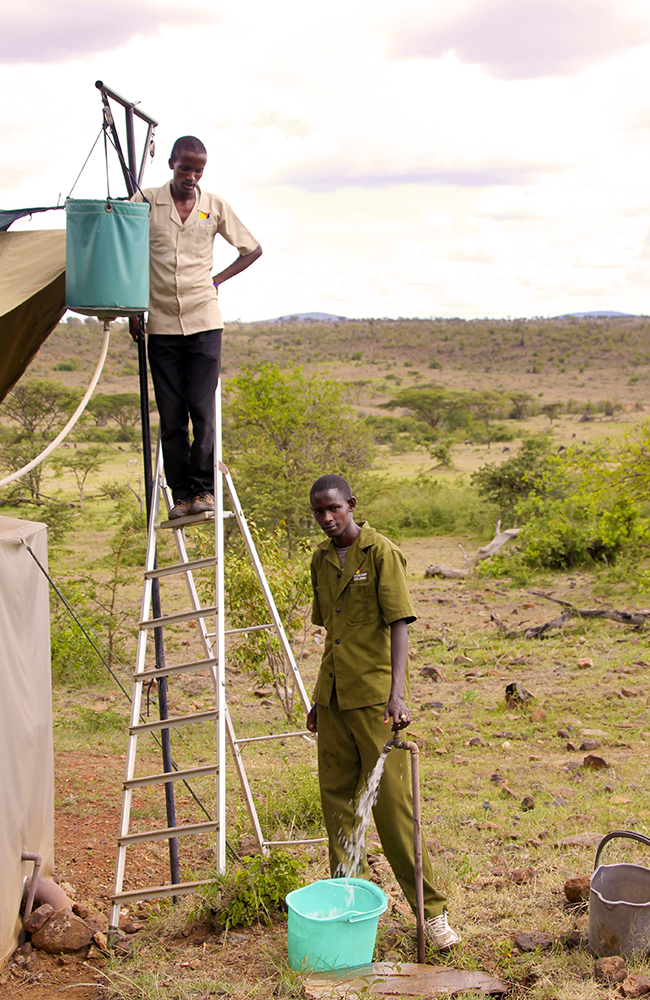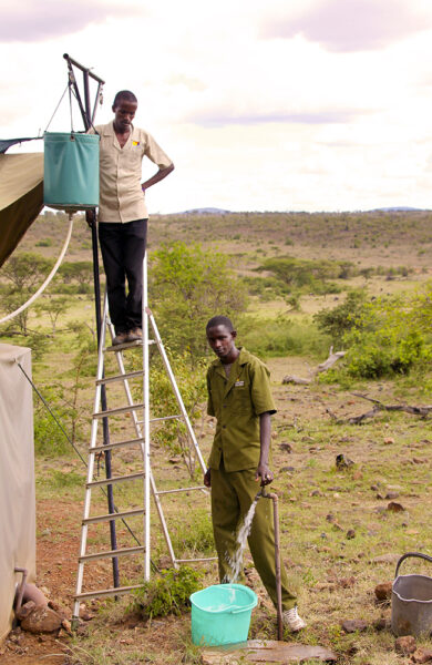 På Basecamp Masai Mara, en av norske Basecamp Explorers tre camper i området, innlosjeres jeg i et stort og romslig telt. Utstyrt med stor seng, lekker utedusj og ordentlig toalett i sideteltet er det ganske langt unna det klassiske bildet på camping. Dette er «glamping» på sitt beste. Og med resirkulert regnvann i dusjen og strøm fra solceller er det lov å nyte luksusen med god samvittighet. Basecamp Explorer har tross alt fått flere priser for sin bærekraftige drift – både med fokus på mennesker og natur.
