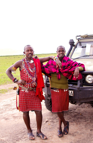 Ingen kjenner Masai Mara bedre enn masaiene. Guidene Mpandi Sayialel (t.v) og Caleb Moriaso vet akkurat hvor de skal lete – og lærer velvillig bort sin kunnskap underveis. Foto: Ida Anett Danielsen