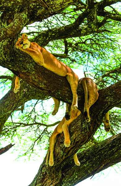 – Løver i trærne, roper han entusiastisk og peker mot punktet der stammen deler seg ut i flere greiner. Jovisst, løver i trærne – to stappmette hunner klamrer seg til de tjukke greinene og hviler hodet på potene.