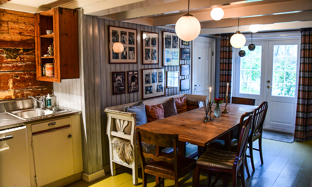 Utenfor rommet ligger det gamle kjøkkenet i et hus fra 1700-tallet, med nesten originalt interiør og knirkende tregulv. Her er det lett å føle seg hjemme.