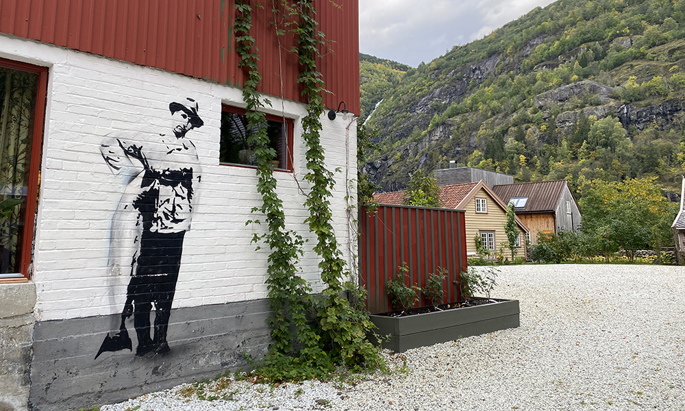 Fiskehuset var et av de første husene i Aurlandsdalen. Det har stått her siden tidlig 1700-tallet, fra den tiden da Aurlandsdalen lå i enden av kvegruta fra Østlandet. Lokale produsenter trengte skinn for å produsere den berømte Aurlandsskoen – den som Michael Jackson «moonwalka» i en kopi av. På veggene henger det bilder fra familien Buxtons fluefiskebragder, ute er det gatekunst på låven signert Newton og inne på låven har kunstnere som Kaja Dahl hatt midlertidige installasjoner.