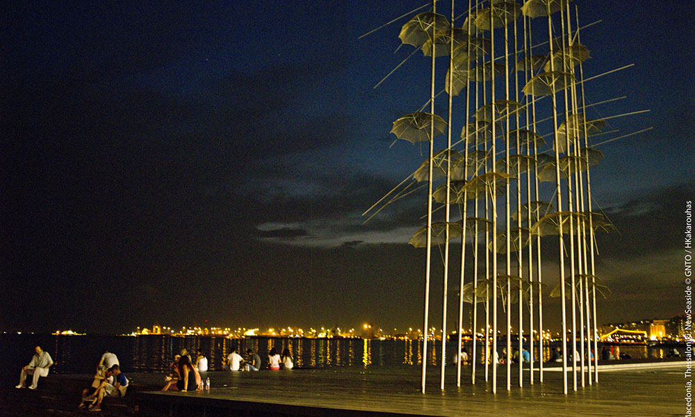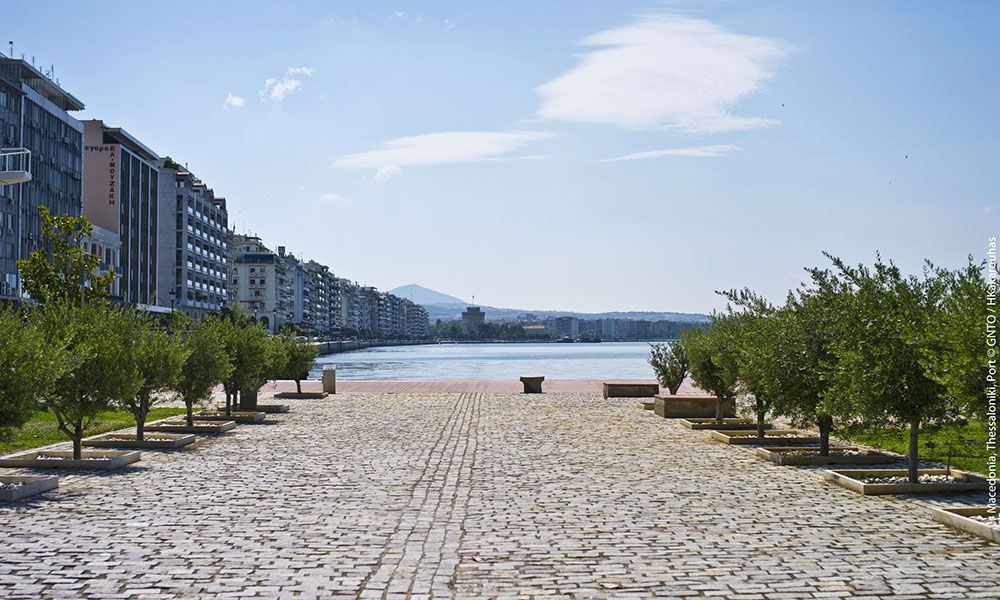 Både de lokale og turistenes favorittpromenade ligger rett ved vannkanten mot Thermaikos-bukten. Promenaden strekker seg hele fire kilometer langs den nye strandkanten (Nea Paralia) forbi Macedonia Palace og opp til byens konserthus. Hele området er blitt rekonstruert, med nybygde fontener, imponerende skulpturer og de iøynefallende «paraplyene» av Zongolopulos.