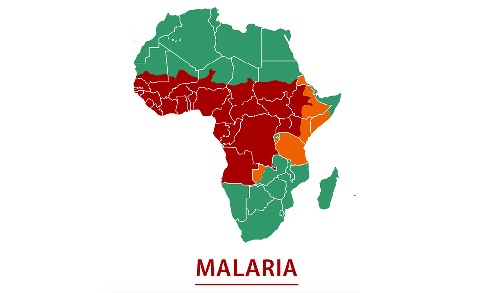 HVA: Malaria er en febersykdom som overføres gjennom bitt av infisert Anopheles-mygg. Det er risiko for malaria i 47 land sør for Sahara, og malariamedisin anbefales ved de fleste reiser hit. Malaria er som regel sesongbetont, med størst utbredelse under og etter regntiden. Malaria forekommer ikke på steder med temperaturer under 20 grader, i ørken (foruten oaser) eller i høyder over 2500 moh.