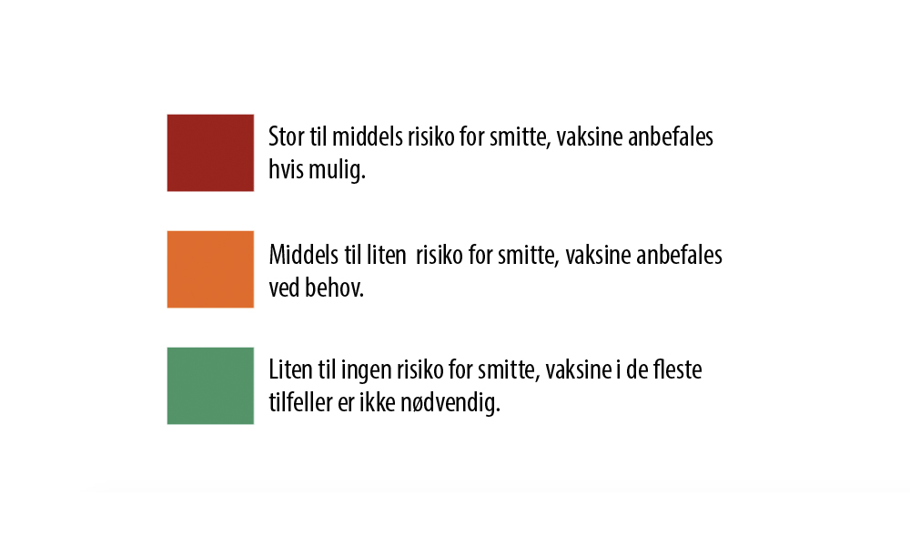 NB: Gulfebervaksinen bør tas minst ti dager før avreise. Noen land krever gulfebervaksinasjonsbevis ved innreise – det gjelder også ved mellomlandinger.