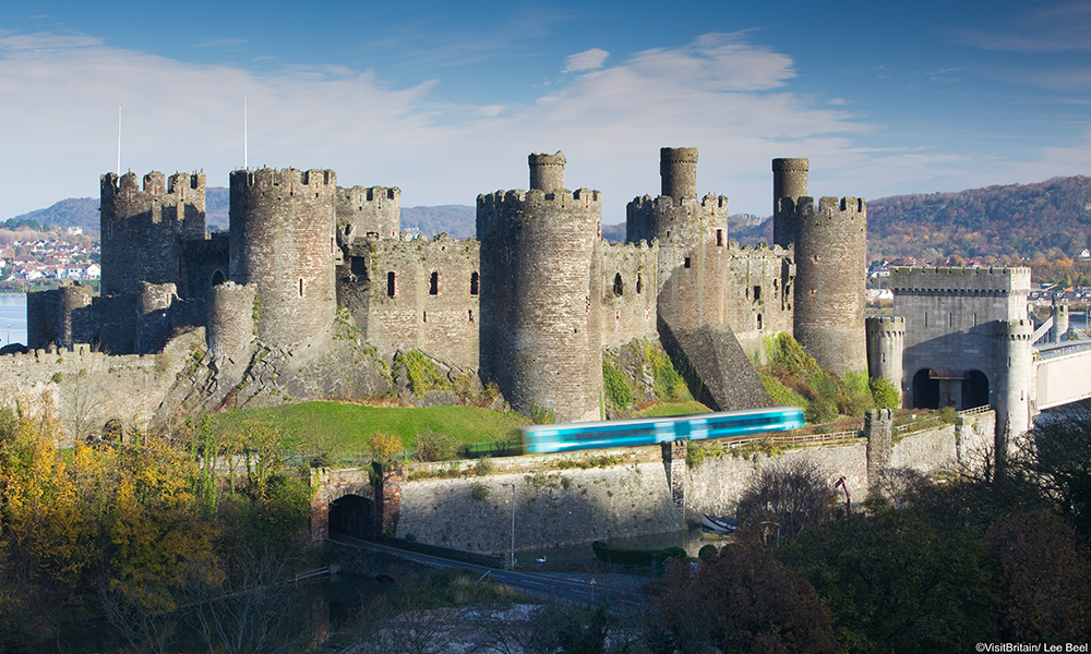 Reis fra Oslo til London via Hamburg og Brussel eller Amsterdam. Cluet her er den britiske «Sail&Rail»-billetten som gjør det enkelt og rimelig å reise videre til både Dublin og Belfast. Hovedruten går via Holyhead i Nord-Wales. Da får vi med oss fint landskap langs kanalene og fortsetter langs kysten av Wales med aden andre. Plutselig er vi også på slottsbesøk med tog, siden jernbaneskinnene er bygget inn som en del av festningsverket Conwy Castle. I Holyhead går vi rett over på ferge som bruker 3 timer over til Dublin. Er det dit vi vil, er vi fremme tidlig samme kveld som vi startet fra London. Vil vi videre til Belfast, går vi på et nytt tog og kan være fremme nøyaktig 12 etter at vi startet fra London.