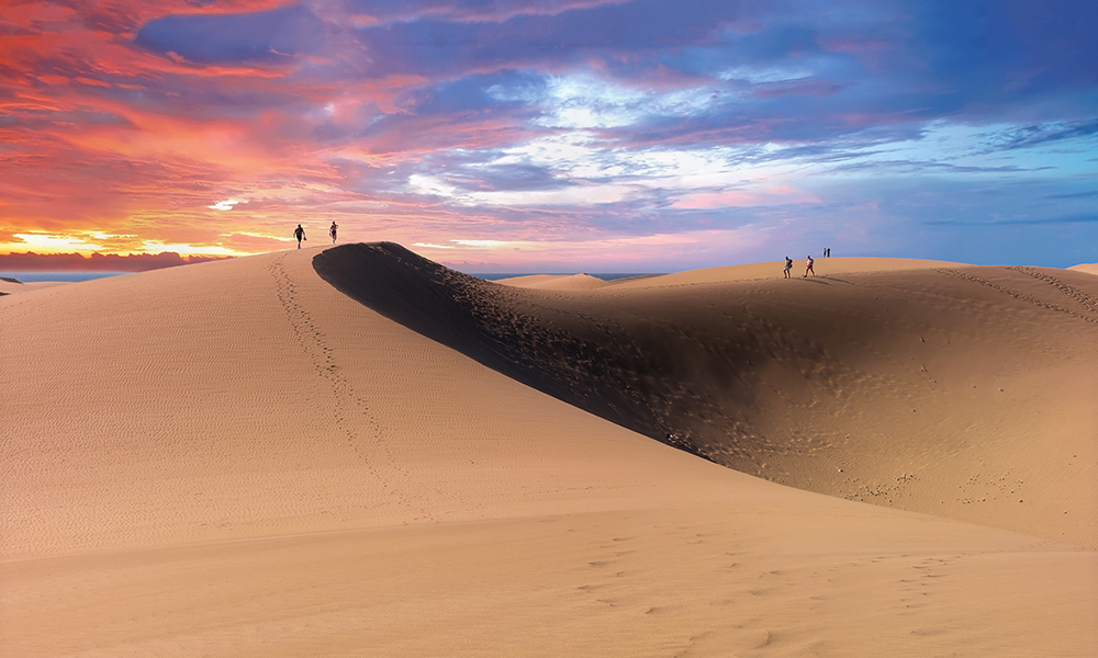 Sanddynene i Maspalomas er Gran Canarias egen mini-ørken, og det vakre området mellom Playa del Ingles og Meloneras er et selvsagt høydepunkt på ferien. Her kan du til og med dra på kamelvandring i en miniversjon av Sahara. Kom gjerne hit til soloppgang eller solnedgang for ekstra gyllen stemning og utmerkede forhold for fotografering. Las Dunas de Maspalomas er et vernet område, og inkluderer også en liten lagune hvor det ofte er yrende fugleliv.