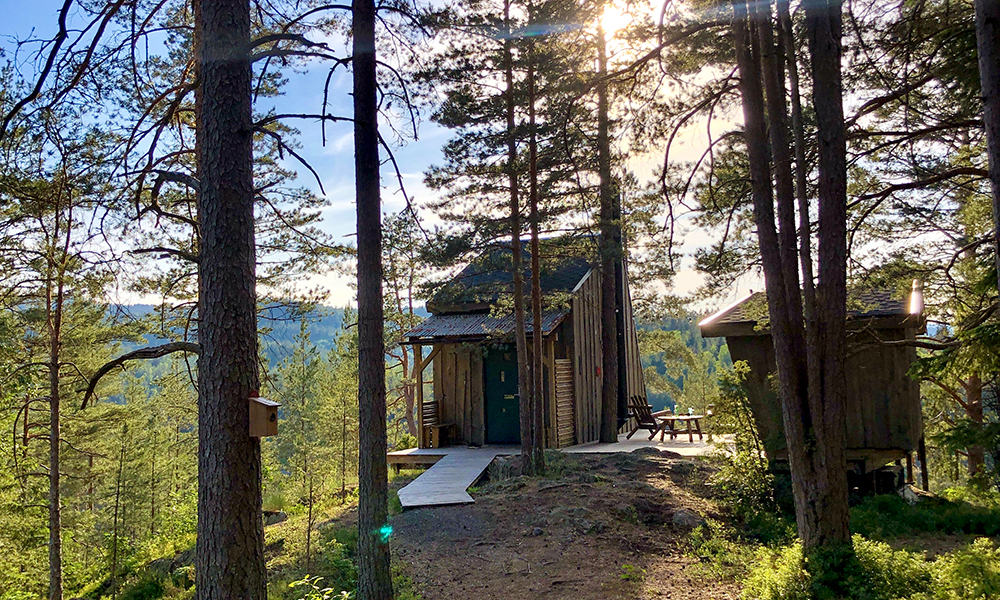 På kanten av et stup, 110 meter over havet, vagler den romslige hytta høyt oppe i tretoppene. I front er det en stor terrasse med bålpanne, spisebord, benker og både fuglekasser og spisebord for ekorn. Straks vi åpner panoramadørene stiger vi inn i en koselig stue, med kjøkkenkrok, et lite bad og et soverom med dobbeltseng. Oppe på hemsen er det store vinduer i alle retninger og sengeplass til fem. Så enkelt, og likevel så fantastisk.