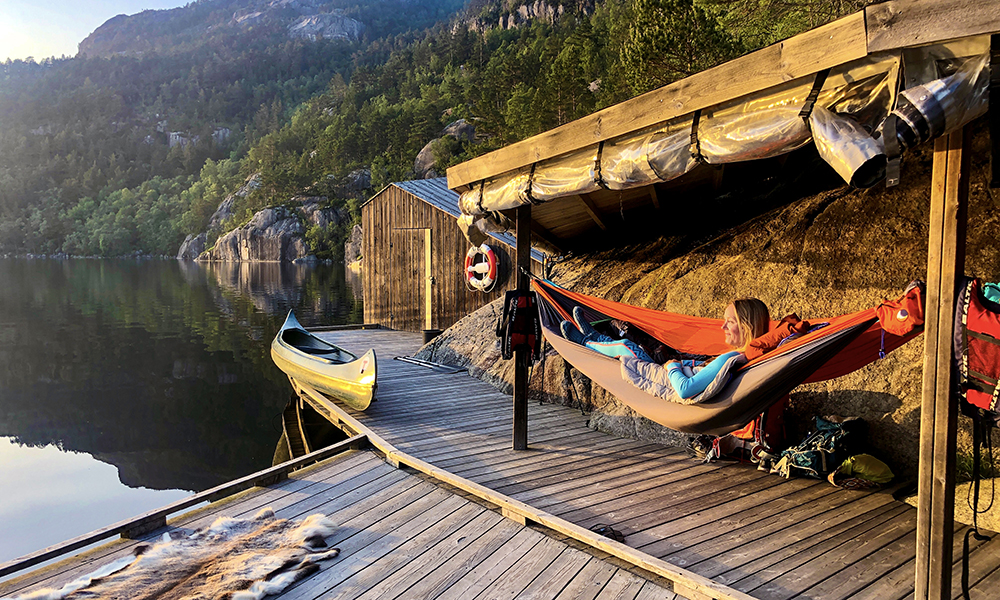 Turen starter i kano ved Preikestolen basecamp, og en koselig 15 minutters padletur til andre siden av vannet til et lite bryggeanlegg med rorbu, takoverheng, bord med benker og en bålpanne. Oppe i skogen, ute av syne, ligger en utedo. Her er det ikke et menneske, og stillheten blir bare brutt av årene som plasker i vannet.