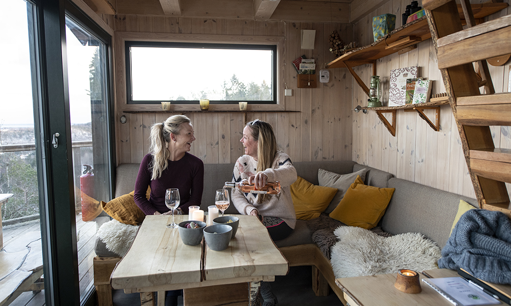 Det er bare å tenne i bålpanna, sprette champagnen og la skravla gå. Vil man oppdage nærområdet fra bakkenivå, er kulturskogen som omkranser hyttene et magisk sted å dra på skogsvandring blant mosedekte trær, barlindens røde bær og misteltein.