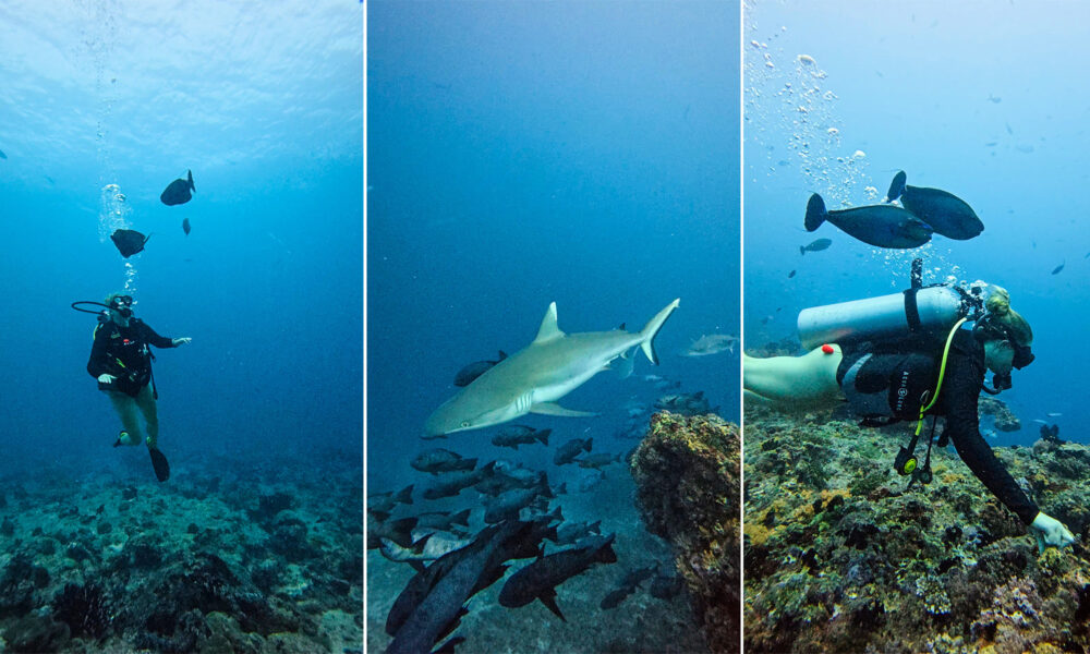 Jeg startet dagen under vann og det var helt topp. Det har vært grått i været og mye vind, men det går ikke an å klage på det når vi har hatt sol nesten alle dager hittil, i monsun-sesongen! Det grå været var for øvrig ikke noe å tenke på under vann. Jeg var så heldig å få se flere ørnerokker (eagle rays), to forskjellige haiarter og store fiskestimer. Det er så fullt av liv der nede og det er så fantastisk å få oppleve!
