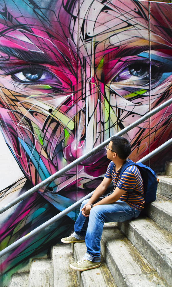 I Tank Lane, har gatekunstnere dekorert veggene. Owen Kam (33) lar seg imponere. Foto: Mari Bareksten