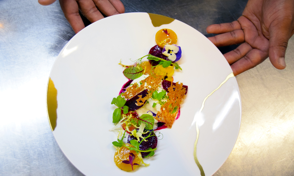 – Tallerkenen er mitt lerret, råvarene min palett, sier kjøkkensjef Mutard Baldé mens han danderer en forrett komponert av rødbeter, urter og blomster.