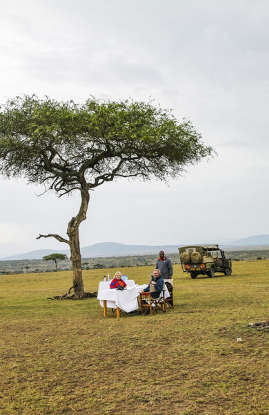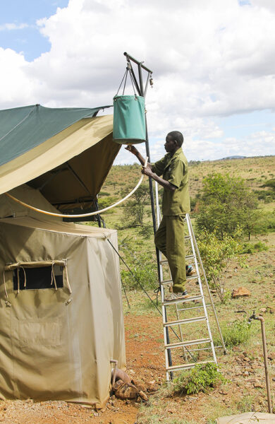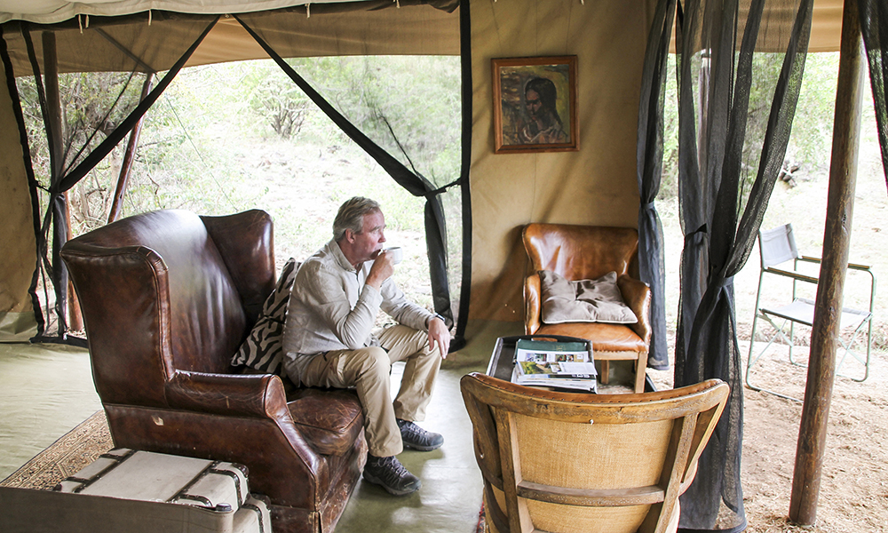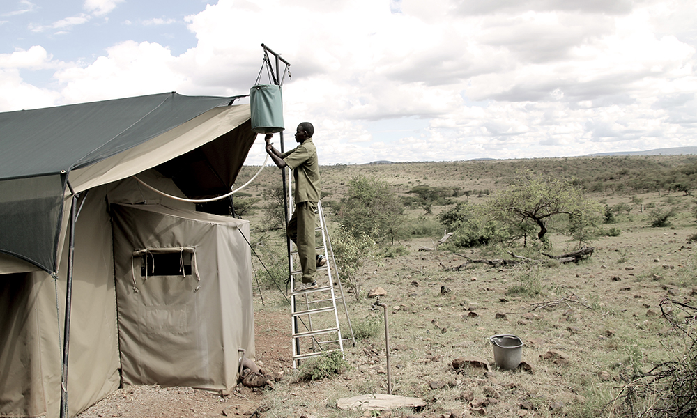 Vi gjør oss klare for en natt ute i villmarken, og sjekker inn på Wilderness, en av Basecamp Explorers tre camper i Naboisho. Campen ligger midt i Saddle Valley-dalen og består av åtte telt innredet med lekre detaljer – og en helt spesiell ro.