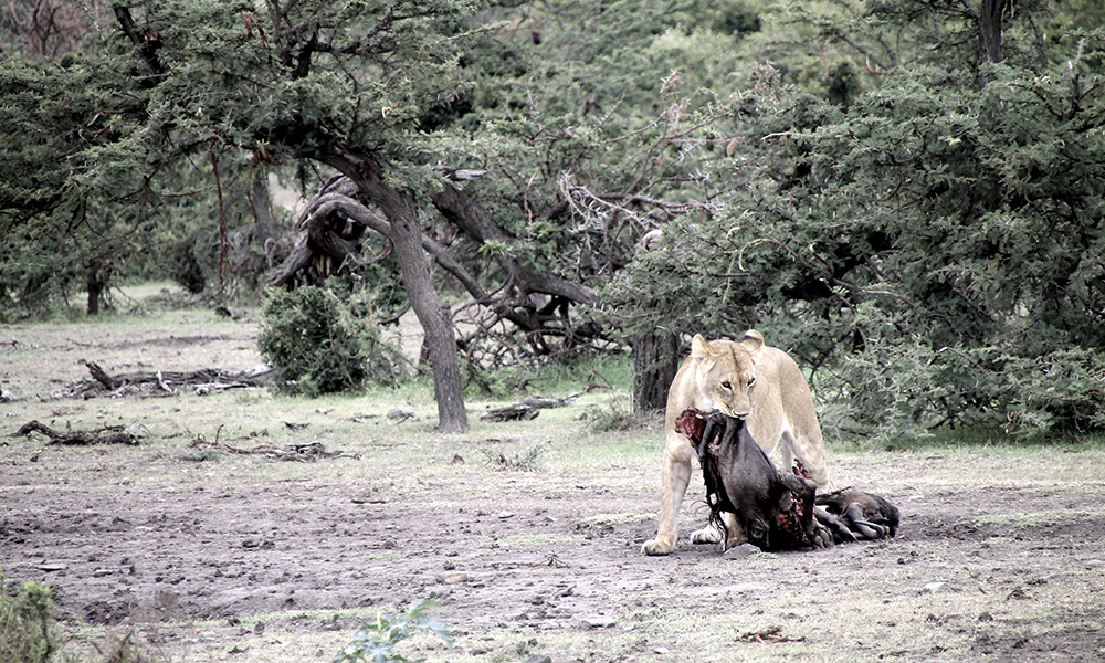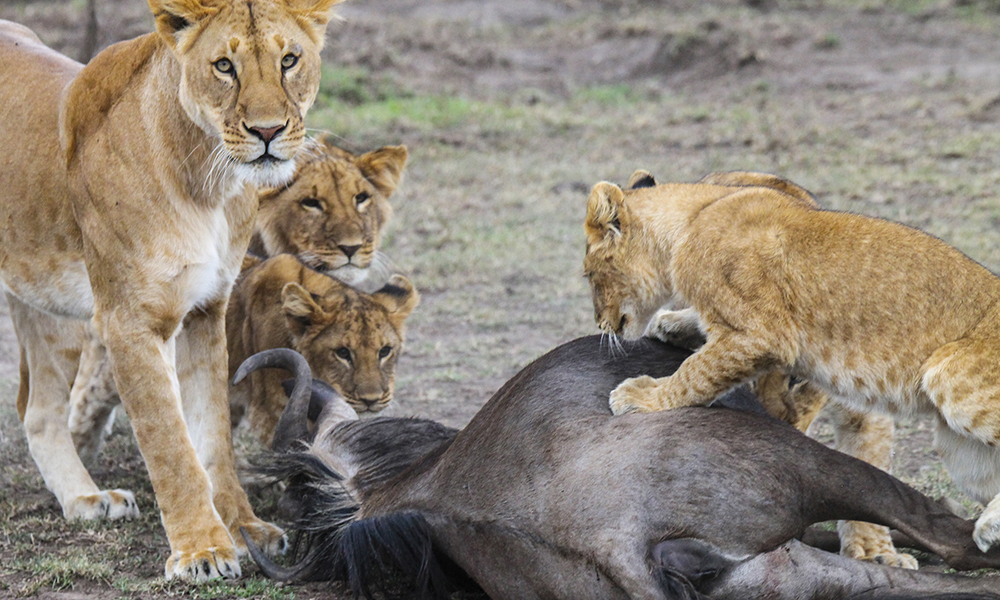 Kun fem meter fra bilen ligger to hunnløver og fem løveunger og knasker på to gnu.