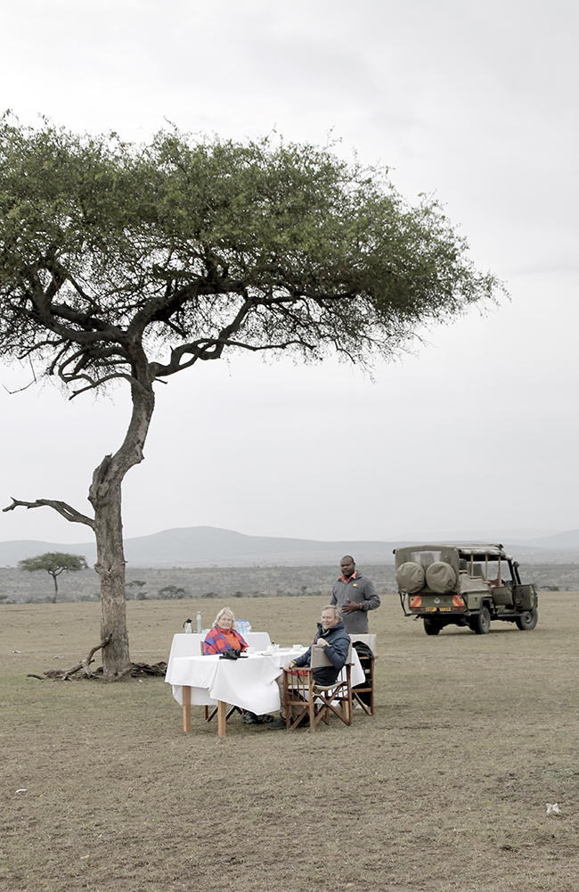 I tillegg blir vi godt tatt vare på. Kun tre gjester skal sove her denne natta, likevel er et tredobbelt antall ansatte på plass for å varte oss opp. Noen tryller frem velsmakende retter til middag, mens andre gjør klart varmtvann til dusjen. Og et par av de ansatte er her rett og slett for å passe på og holde dyrene unna. Vi befinner oss jo tross alt langt ute på den afrikanske savannen.