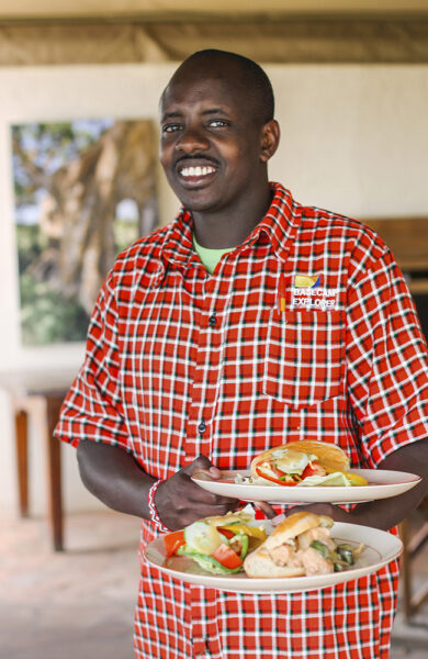 Til middag serveres nok en nydelig tre-retters akkompagnert av Basecamps egen safarivin fra Sør-Afrika, og på nattsafari får vi se nye dyr som afrikansk kenguru og flaggermusrev. Dagen etter er det frokost med nystekte egg og bacon, midt ute på savannen. Safarilivet er herlig!