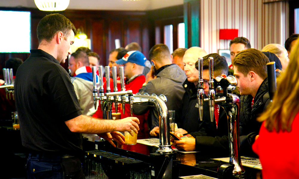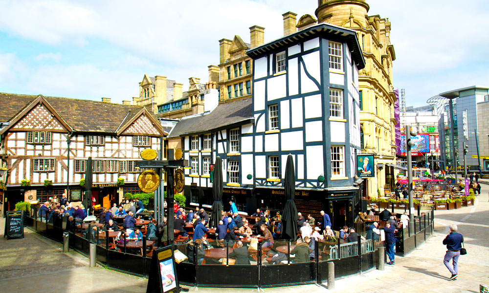 På Manchesters mange pubber kan man alltid ta seg en øl før og etter kamp. Her på Shambles Square. Foto: Runar Larsen