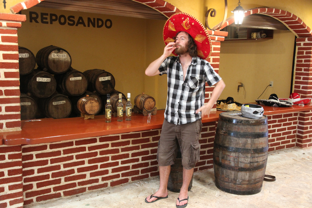 Tre glass med innhold hvis farge går fra helt blankt til lysegult plasseres på benken foran tønnene med Mayapan. En diger sombrero, et par skiver lime og litt salt kompletterer prøvesmakingen, men dette er alt for syns skyld.