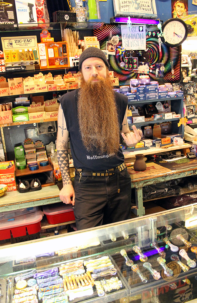 Den karakteristiske butikken er fylt opp av lokalproduserte og fargerike glasspiper, vannpiper, plakater og klær. Asher har jobbet her i 16 eller 17 år, han husker ikke helt.