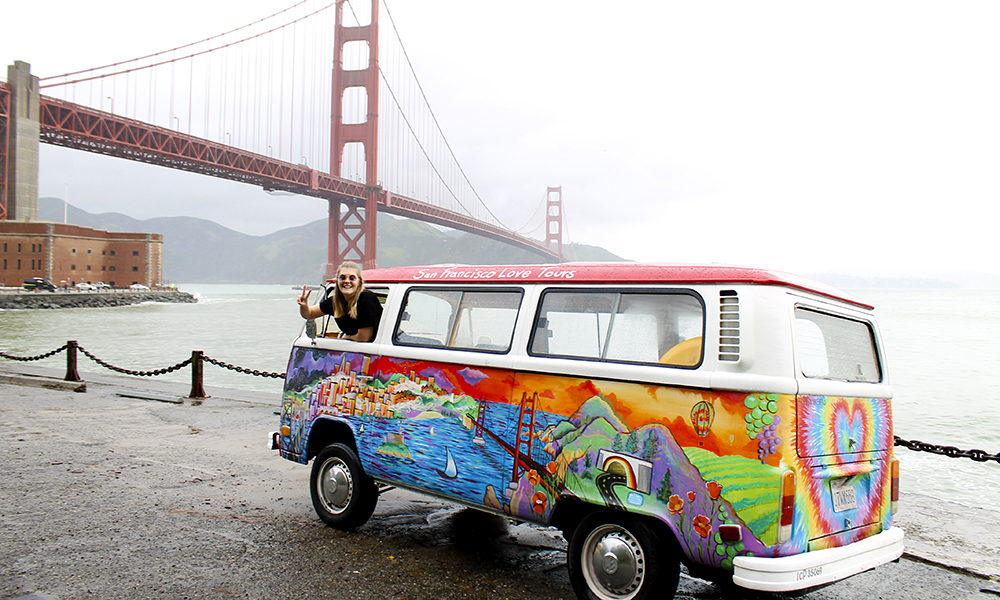 Hopp inn i en blomstrete og fargerik Volkswagen 1973-modell og kjør gjennom byen med stil! San Francisco Love Tours arrangerer flere turer daglig, med et historisk innblikk i byen krydret med 60-talls hippiemusikk og god stemning. Ca. kr 420 per pers for to-tre timers tur. Husk å bestille på forhånd, da bussene kun har seks plasser om gangen.