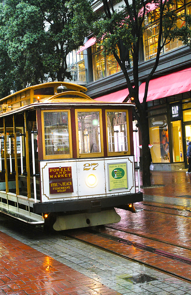 Et must i San Francisco! De tradisjonelle kabelvognene er også et nyttig fremkomstmiddel i byen som nesten bare består av bratte bakker og gater – og er en flott måte å få en historisk sightseeing. Billett kjøpes enten på automat eller av konduktøren ombord, fra kr 25 til 60.