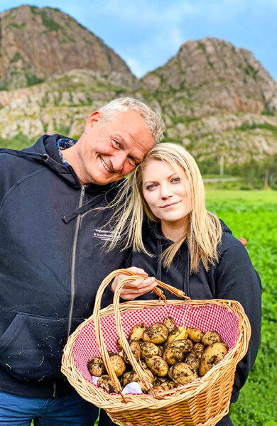 – Og Torghatten inside kan jo ikke starte uten å ha vært på Torghatten, ler far Per Kåre Hatten hjertelig idet vi trasker ut av gårdsplassen, forbi en bakhage med bærbusker og opp til et jorde breddfullt av poteter.