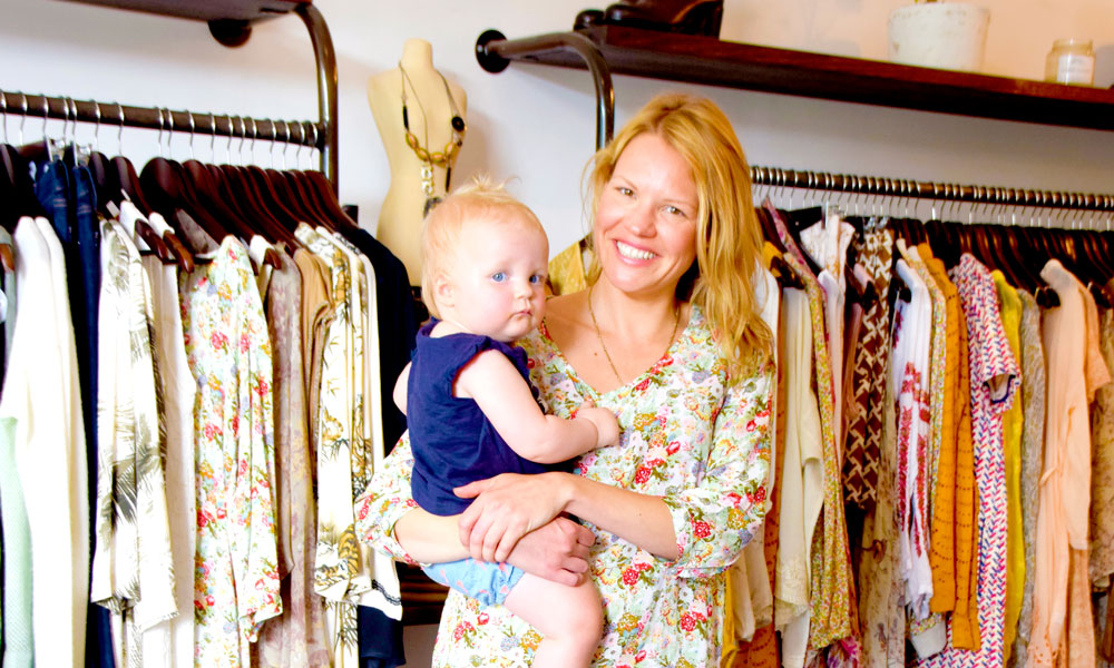 I klesbutikken Who Invited Her i Fitzroy står butikkeier Zoe West (39) med datteren på armen. Sånn er det å drive butikk. Foto: Mari Bareksten