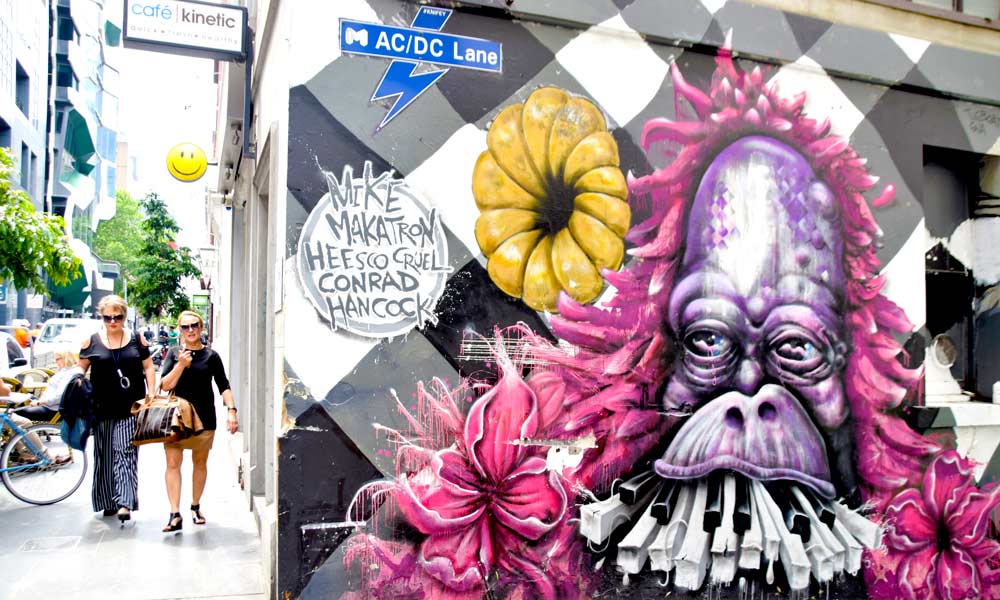 Flinders Lane er sammen med Hosier Lane og AC/DC Lane (bildet) de beste gatene å se gatekunst. Foto: Mari Bareksten