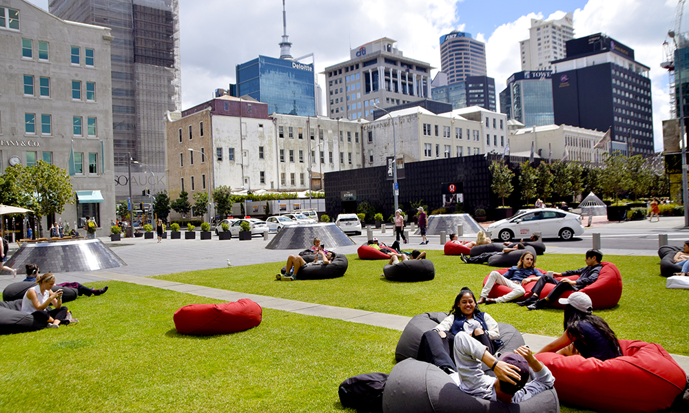 Ved det sentrale shoppingområdet Britomart kan du i shoppingpausene slappe av i en deilig sakkosekk. Foto: Mari Bareksten