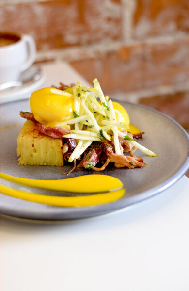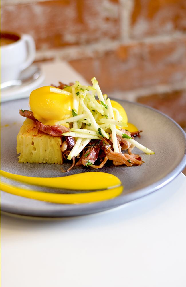Eventyrlysten førte henne så langt unna Malmö det går, og nå setter hun en av byens mest Instagramvennlige frokostretter fremfor oss. Det er en lokal vri på Eggs Benedict: to perfekt posjerte egg toppet med eplestrimler, pulled bacon fra en gård i nærheten og eplesider hollandaise.