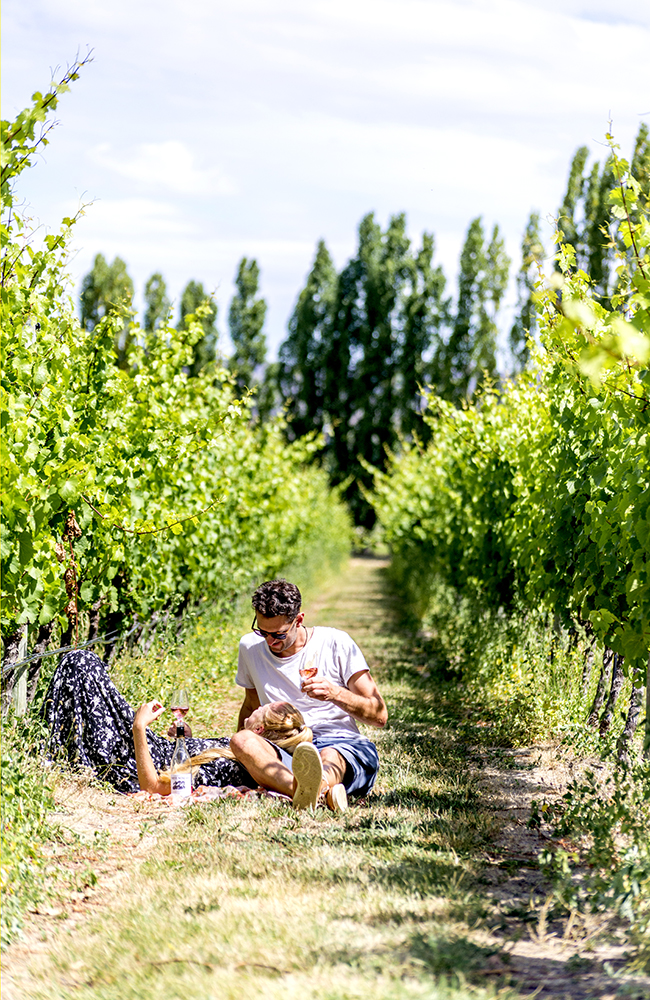 De har akkurat bestilt en flaske rosé og nyter den varme sommerdagen på uteserveringen til vingården Cable Bay. Gressplenen er fylt med behagelig sakkosekker.