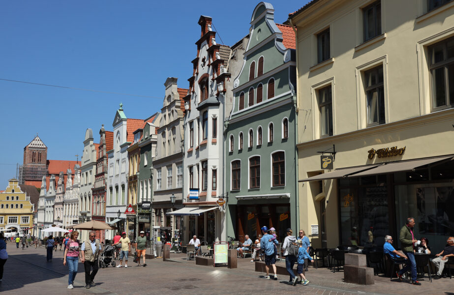 Han peker på den ruvende gotiske Marienkirche i tegelstein, hvor det røde tårnet strekker seg 104 meter til værs – litt lavere enn de 154 meterne det var på 1500-tallet. I en periode var det verdens høyeste bygning. Vi går innom Fischandler H. Rasmus, hvor Angela Merkel kjøpte en kasse sild til George W. Bush under presidentens besøk i Tyskland i 2006 (verdt et bildesøk!), og hvor dagens sandwich er sursild med majones og løk. Det er smaken av Østersjøen, og en tidløs snack. På motsatt side av gata er det full rulle med langt mer moderne aktiviteter.