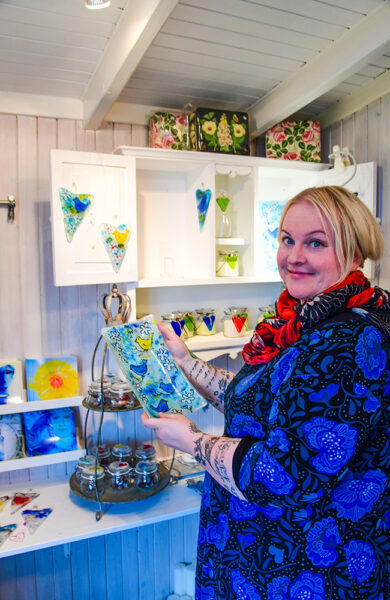 – Jeg hadde glassverksted nede, men det har jeg flyttet hjem til hagen. Det gir jo en helt annen arbeidsro. Dessuten har kreativitet ingen arbeidstid. Glassarbeid tar 16 timer, og mye av det spennende skjer midt i prosessen. Da er det fint å ha verkstedet så nær hjemmet, mener småbarnsmoren, som opprinnelig er utdannet billedkunstner. Men det skal litt til for å slå gjennom, og Siv begynte med skåler og små gjenstander i glass isteden. Utprøvingene laget hun i hjerter.