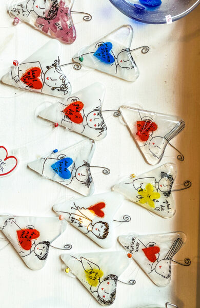 Veggene i det gamle trehuset er dekort med skjør og fargerik glasskunst, noen i store trerammer, andre organisert som uroer; hyller er fylt med små og vakre glassgjenstander, figurer og ikke minst – hjerter.