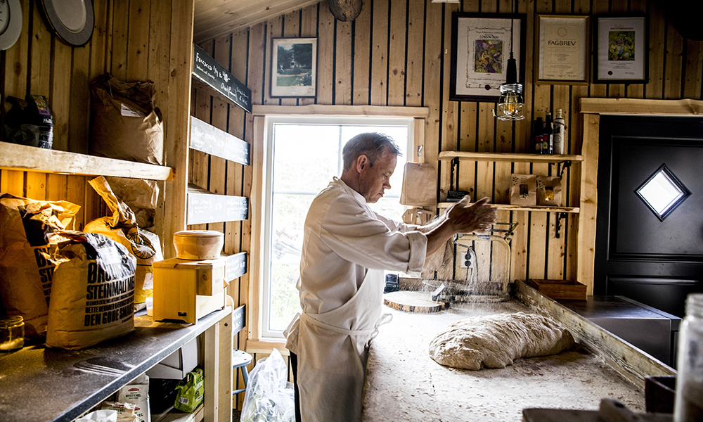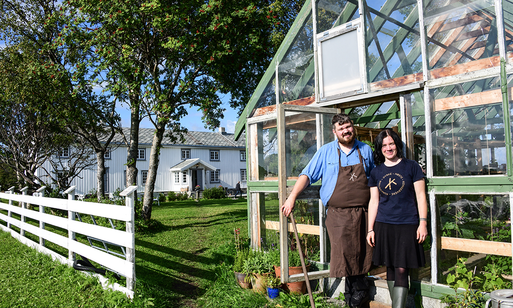 Om vi er kreative? Alltid. Vi må bruke det vi har, sier Halvar og smaker på en nyplukket nepe ute i kjøkkenhagen bak den hvite hovedbygningen.
