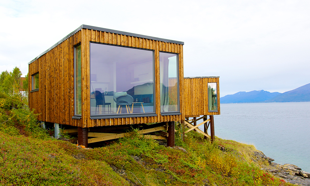 Det tar to minutter å gå fra baren i verdens nordligste whiskydestilleri og ned til de moderne hyttene som hviler på påler over fjorden.