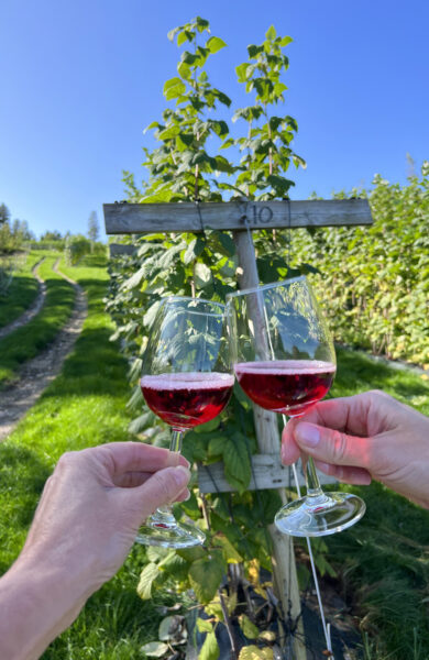 Nå lager de vin, isvin, dessertvin og musserende vin, har vinsmakinger i bringebæråkeren, produserer og lagrer vin i den gamle grisebingen, og selger mer enn 7000 flasker med bringebærvin rett fra gården. Fire av vinene får du til og med kjøpt på Vinmonopolets bestillingsutvalg, og dessertvinen ble kåret til årets fruktvin i 2019. Og det skal sies: Vinene er mye bedre enn man skulle tro, langt unna de klissete og søtladne fruktvin/likørene jeg har smakt andre steder. Flere av dem serveres også på noen av Oslos bedre restauranter, som Vaaghals, Hot Shop og Radagast. Den boblende bringebærvinen er rett og slett så god at den fint kan drikkes alene, godt avkjølt, på terrassen en solfylt sommerkveld. Vi tar med et par flasker fra gårdsutsalget og haster av gårde til neste stopp.