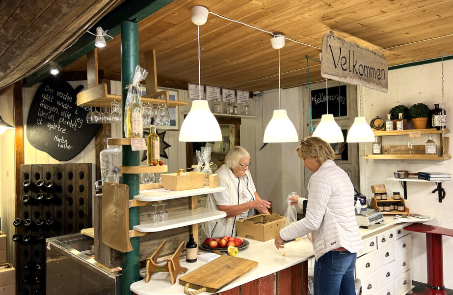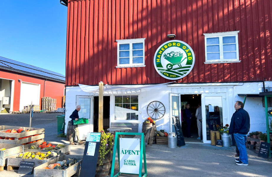 Vi er på besøk mot slutten av sesongen, men maisen står gul og solmoden i åkrene, og høstblomstene farger et helt jorde i lilla, oransje, gult og burgunder. På en kort time har vi fylt veskene med det de kan bære, og hadde vi hatt tid kunne vi fyrt på grillen som står tilgjengelig for alle kunder. Men vi skal trakteres med en kongelig lunsj på Oscarsborg festning, så her gjelder det å komme sulten til bords.