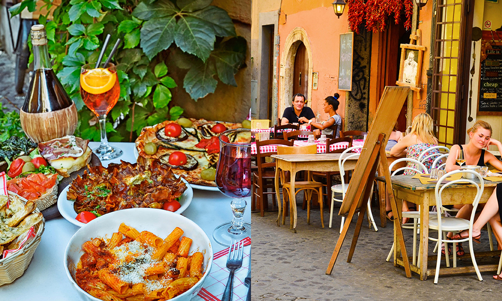 For mange er det gastronomien som er byens store attraksjon. Dette er tross alt en av verdens mest smakfulle storbyer, med trattoriaer, pizzeriaer og 16 restauranter med stjerner i Michelinguiden. Det italienske kjøkken, med røtter tilbake til 300-tallet, er trolig et av verdens mest kjente. Vil man slå på stortromma og spise en romantisk middag under stjernene med førsteklasses utsikt til Colosseum, er det verdt å sjekke ut stjernerestauranten Aroma. For den som heller foretrekker et pastamåltid i ekte «Lady og landstryker´n»-stil er carbonaraen til La Carbonara dal 1906 byens beste, mens La Taverna dei Fori Imperiali er viden kjent for den klassiske Roma-matretten cacio de pepe, toppet med fersk trøffel.
