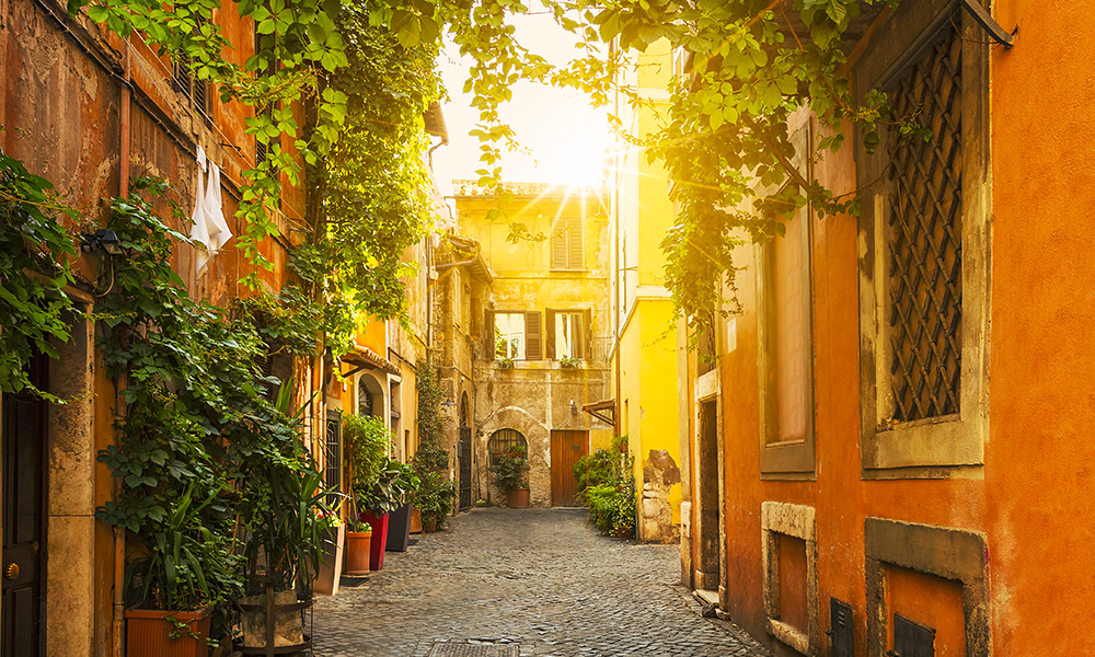 Roma har flere sjarmerende bydeler. Unge og hippe kjærestepar bør ta turen innom byens eldste nabolag Monti, rett ved Colosseum. Her ligger vintagebutikkene side om side med mer trendy restauranter som Urbana 47 og Ai Tre Scalini. Her finner du også takterrassebaren Spritzeria Monti, med utallige varianter av den italienske cocktailen Spritz, pyntet med alt fra rosmarin til frysetørkede frukter. Trastevere i den vestre delen av Roma er et annet koselig område og en labyrint av hygge, på andre siden av elven Tiber. Nabolaget er kjent for sin bohemske atmosfære med trange smug, full av koselige uteserveringer.