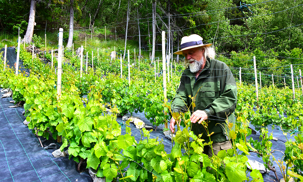 Bjørn Bergum (65) og ler godt under stråhatten. Men ingen vet hvor eventyret om verdens nordligste vingård vil ende.