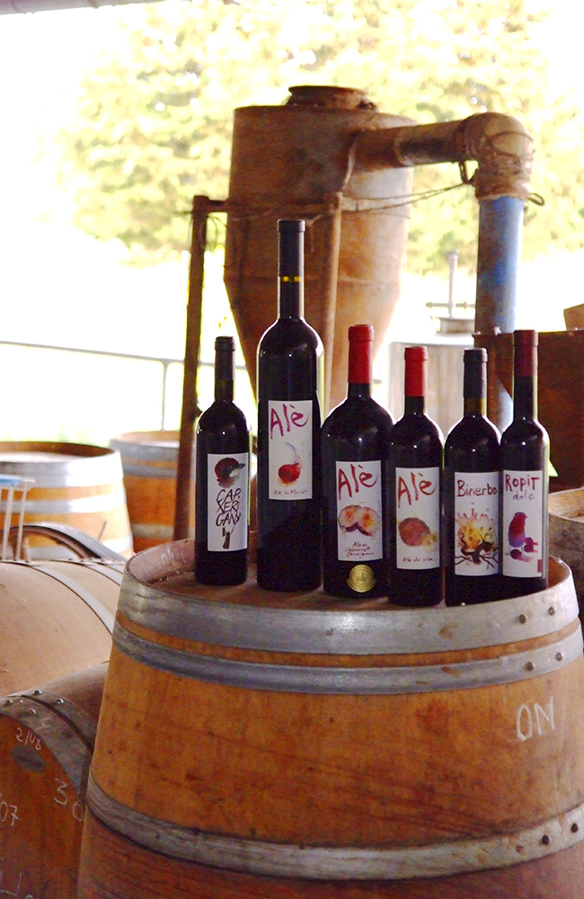 Selv vinen kommer fra egen hage. Hele gården er omgitt av de frodigste vinranker, som aldri har sett et sprøytemiddel. Isteden pleies de med omtanke og kjærlighet, og er omgitt av blomster som skal trekke til seg udyr og uønskede gjester.